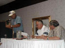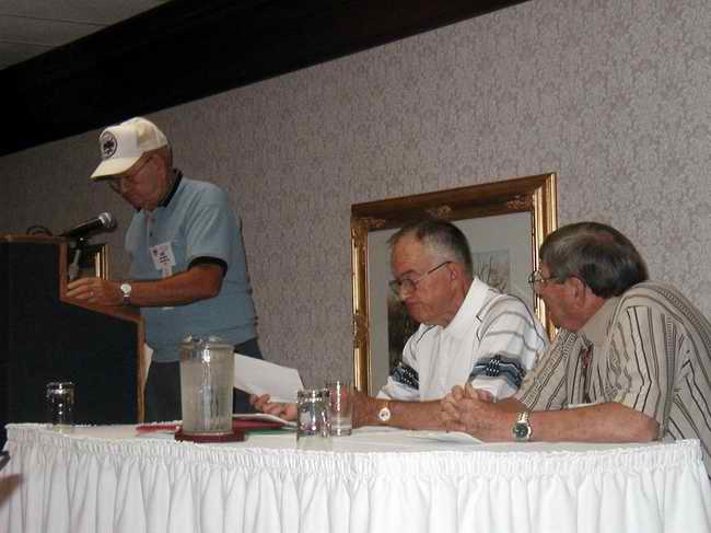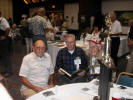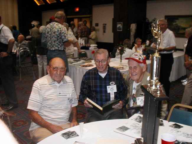 Ernie Lamson (rt) and friends swap war stories at the Reunion CP and, perhaps, guard the president's Trophy. |