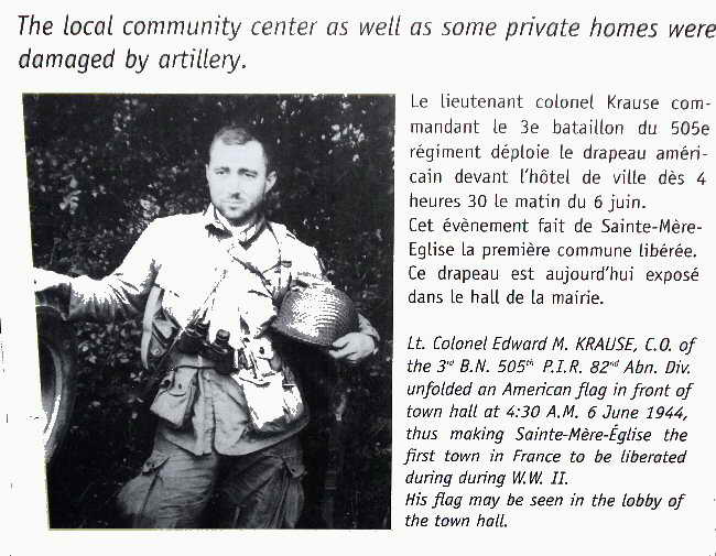 It All Started Here Lt. Col. Edward. Krause, C.O. of 3rd Bn., 505th PIR raised an American flag at the Ste. Mere Eglise City Hall at 0430 hrs, June 6, 1944 making Ste Mere Eglise the first town liberated. (courtesy Liz Coble)