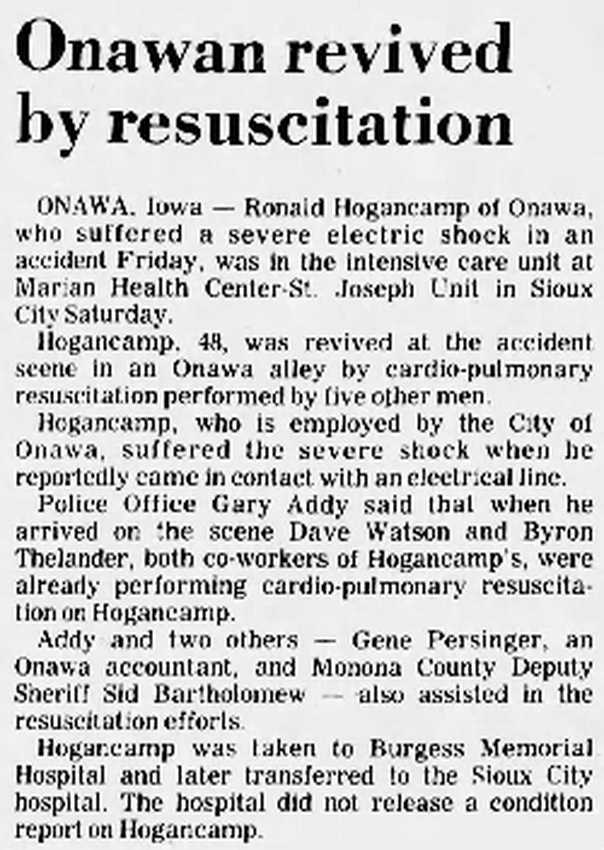 Hogancamp, 48, was revived at the accident scene in an Onawa alley by cardio-pulmonary resuscitation performed by five other men.