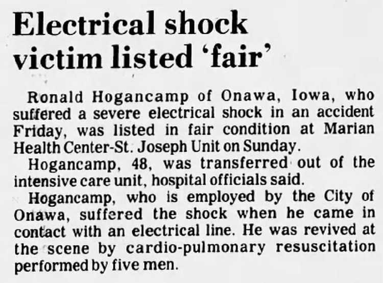 Hogancamp, who is employed by the City of Onawa, suffered the shock when he came in contact with an electrical line. He was revived at the scene by cardio-pulmonary resuscitation performed by five men.