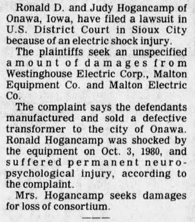 The complaint says the defendants manufactured and sold a defective transformer to the city of Onawa. Ronald Hogancamp was shocked by the equipment on Oct. 3, 1980, and suffered permanent neuropsychological injury, according to the complaint.
