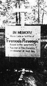 However, some of us often wonder? Did the NCO really dig that hole? Who helped with the stones, and who made the sign? Also, someone ought to tell that German that mows the lawn about that aged bottle of Spanish Brandy underfoot. The sign reads:  IN MEMORY Here Lies a bottle of“ Franco’s Revenge”Found in the quarters of two men in this Company in violation of Regt. Reg.