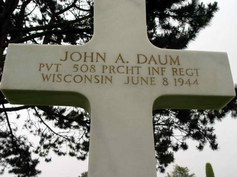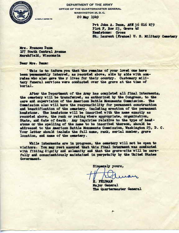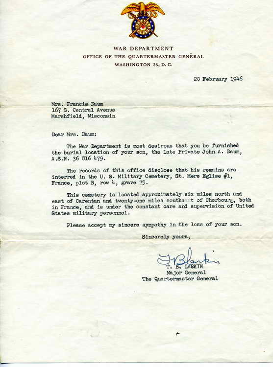 the Quartermaster General advises Mrs. Daum of John's grave site in
