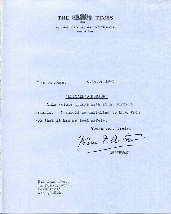 1953 enclosed letter from John Astor, Chairman (of the Times?) is