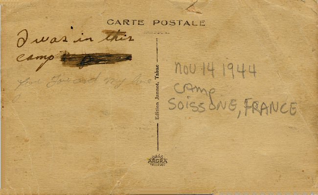 Sissonne Postcard (reverse) Pfc. Gonzales wrote "I was in this camp, Nov.. 11, 1944" |