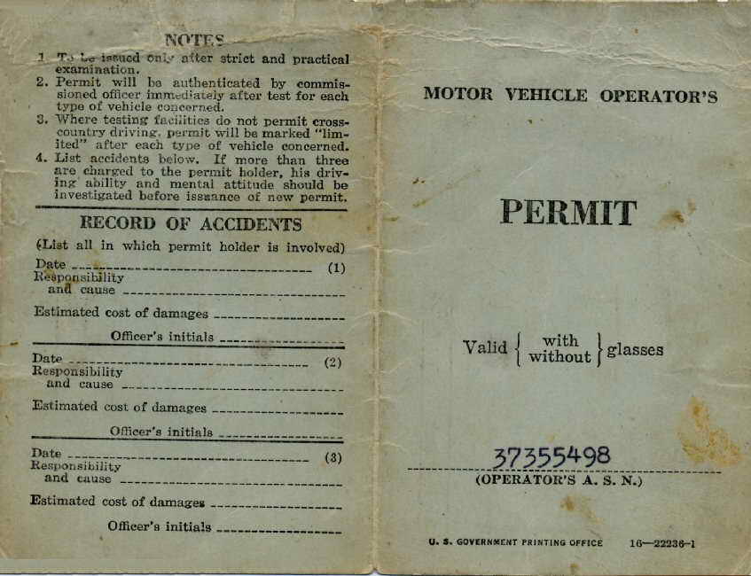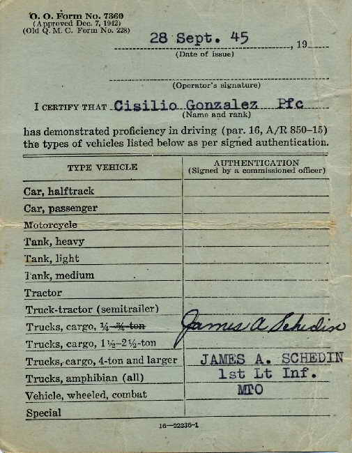Drivers Permit (Pages 2 & $) Pfc. Gonzales was licensed to drive 1/4 ton trucks, which probably meant "Jeeps". |