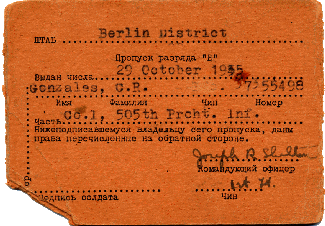 Military Day Pass into the Berlin District, dated December 1945 The first page is annotated in Russian Cyrillic. This sample was issued to Pfc. Cisilio R. Gonzales, HQ HQ. |