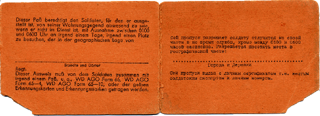 Military Day Pass also dubbed as "Orange Cards". Page two is written in German while page three is in Russian |