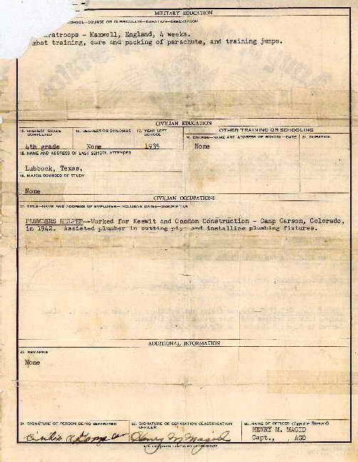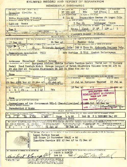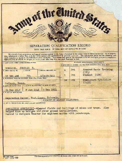 Separation Qualification shows that Pfc. Gonzales spent 3 years and 22 days in the Army, almost equally split between training in the U.S. and in the ETO combat theatre. The reverse side documents that he had a 4-week school in parachute training taken at Maxwell, England |