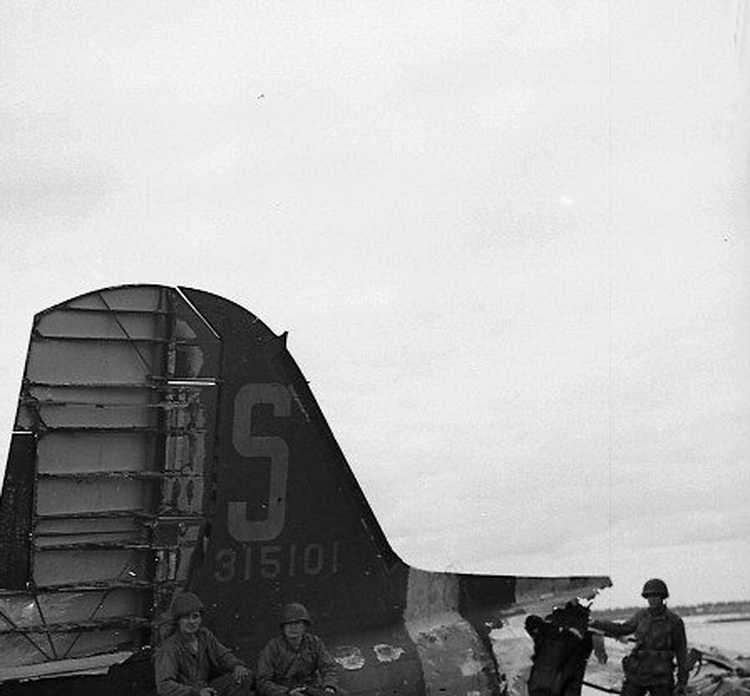 sit on P-38 wreckage. The U.S. "Stars and Bars" and a "7X"