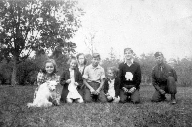 [l-r] girl with dog, Joan, Elaine, Charles, John, James |