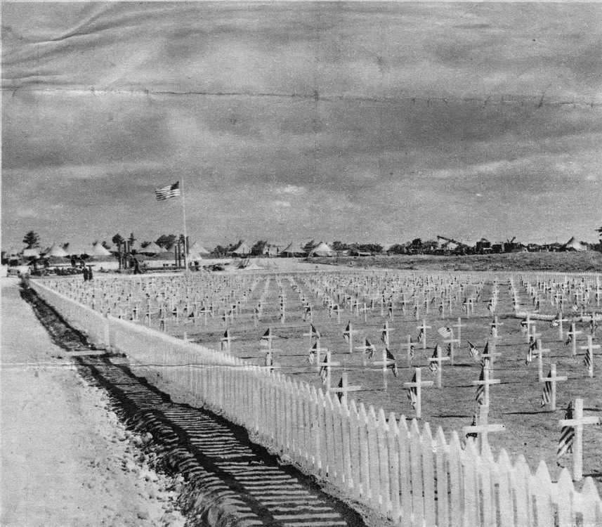 shows the temporary cemetery at Colleville-sur-Mer atop the bluff