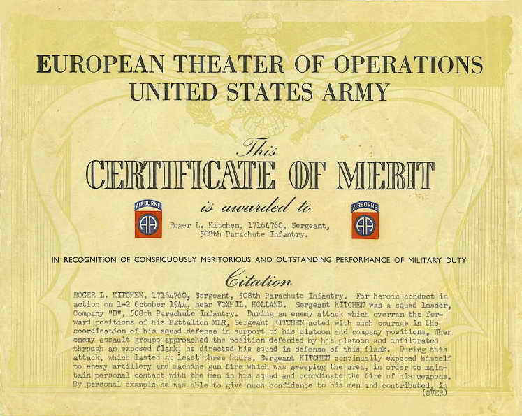 Sgt. Roger L. Kitchen received this citation for "... conspicuously meritorious and outstanding performance of military duty".