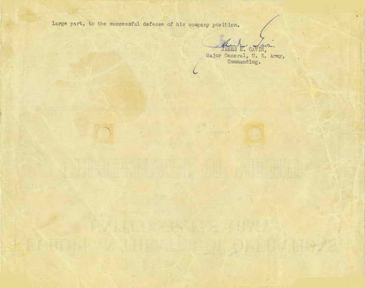The citation was signed personally by Major General James M. Gavin. It is not known whose handprint has been impressed on the upper left-hand corner of the document