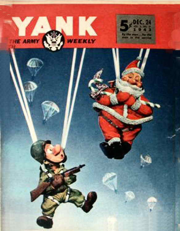 The presence of thousands of 82nd and 101st Airborne Division paratroopers had an enormous impact on the English populace and undoubtedly the impending holiday spirit Their preferred mode of transportation undoubtedly gave the artist an idea for Santa to arrive differently that year. According to the John Hay Library, "Yank was the most widely read and most popular magazine in the history of the army and by the end of the war, twenty-three editions had been published. At the height of Yank's operations, there were printing presses in Honolulu, Cairo, Tokyo, Okinawa, Rome, Trinidad, Saipan, and other places, and the weekly achieved a worldwide circulation of 2,600,000; it is thought to have been read by ten million. The weekly which was staffed entirely by enlisted-soldiers printed its last issue in December 1945, realizing for the War Department a profit of $1,000,000." |