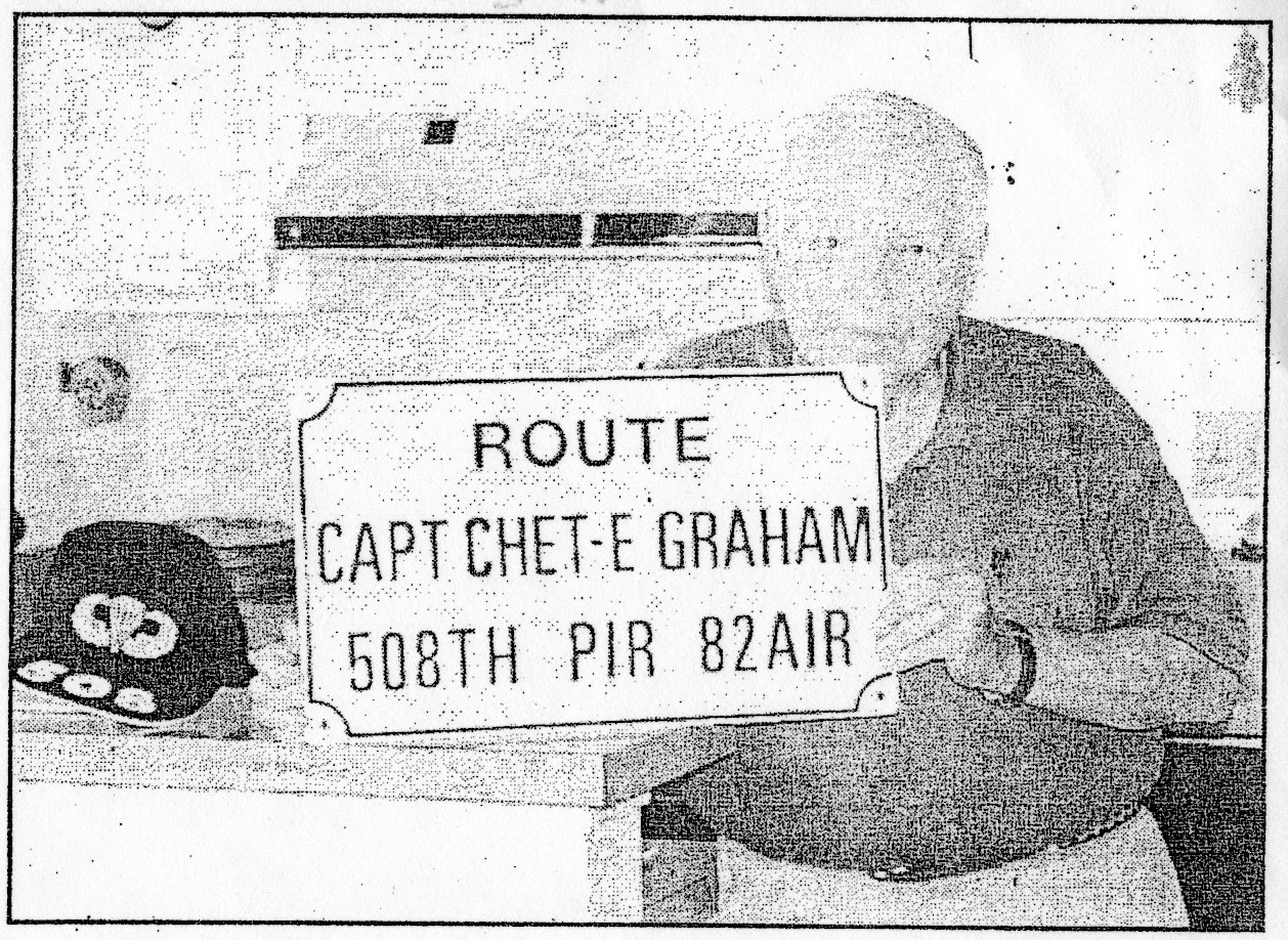 "Route Capt. Chet Graham, 508th PIR 82AIR." The sign indicates that