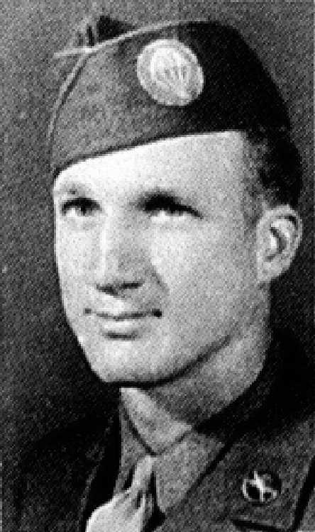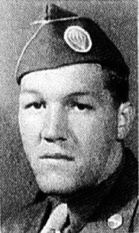 Jesse Rodriques from company photo at deactivation, Camp Kilmer, NJ, 1946