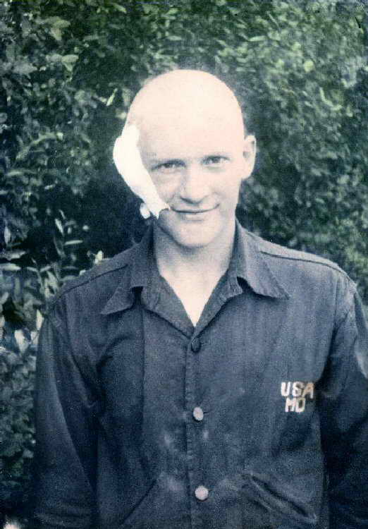 hit by artillery shrapnel on 22 Jan 45 had his head shaved and