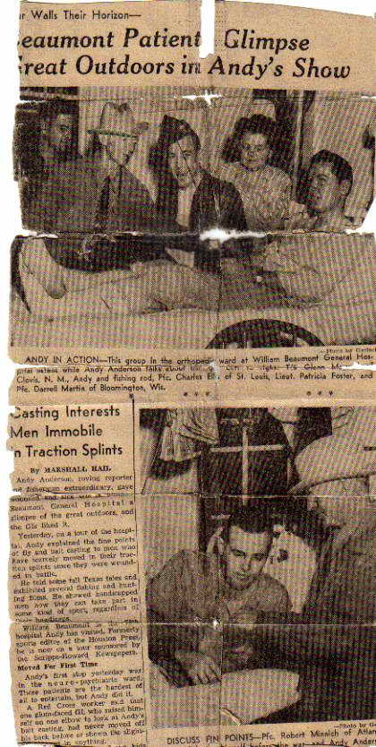 Charles H. Ellis was wounded in the Holland jump and landed in the William Beaumont Hospital at Fort Bliss, Texas. While convalescing, Ellis (center in photo) joined others as Mr.. Andy Anderson entertained with fishing stories and demonstrations of fishing gear. The visit proved therapeutic for bedridden Pvt Robert Minnisch, shown here raised on his elbow in his hospital bed. According to the article, it was the first time that he had raised himself from a prone position. |
