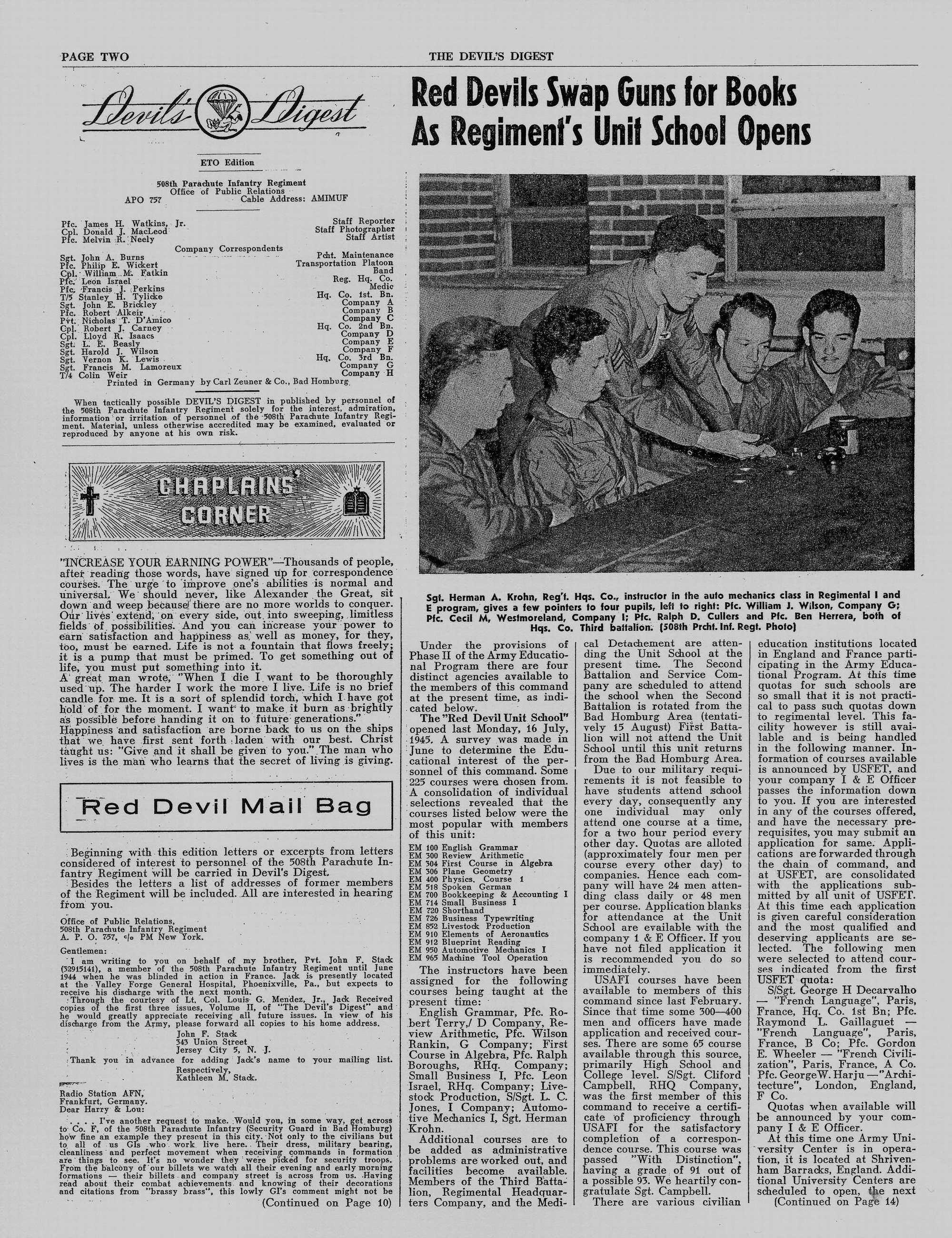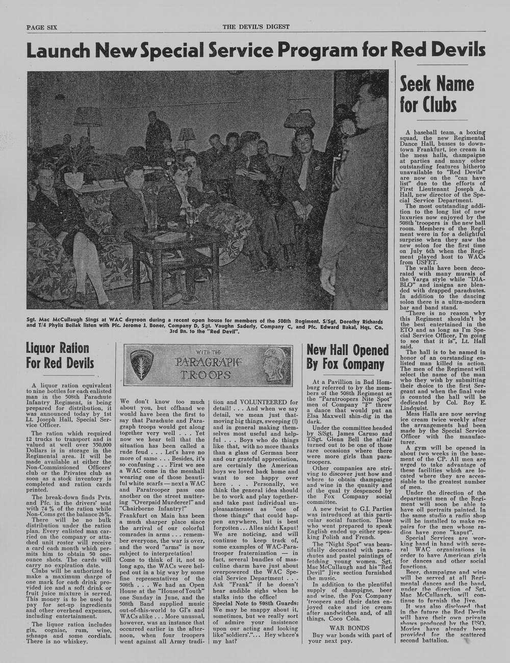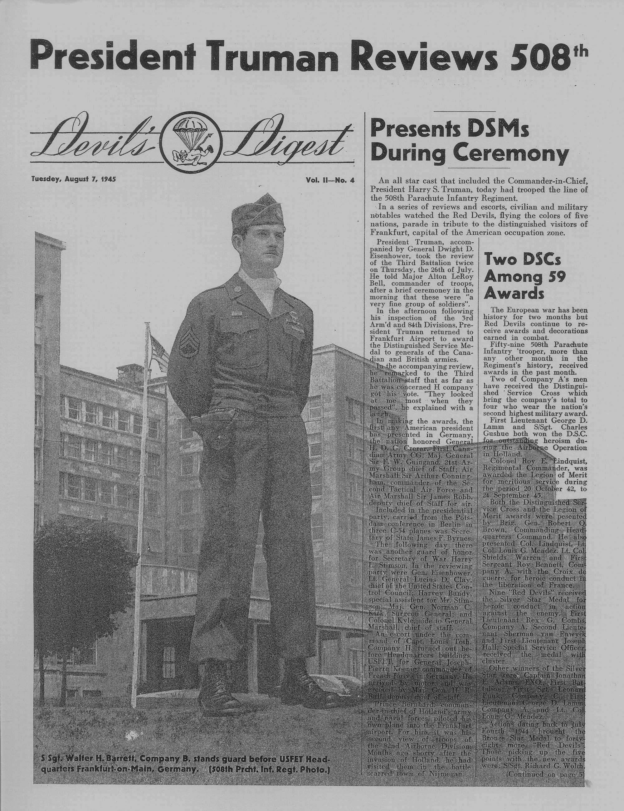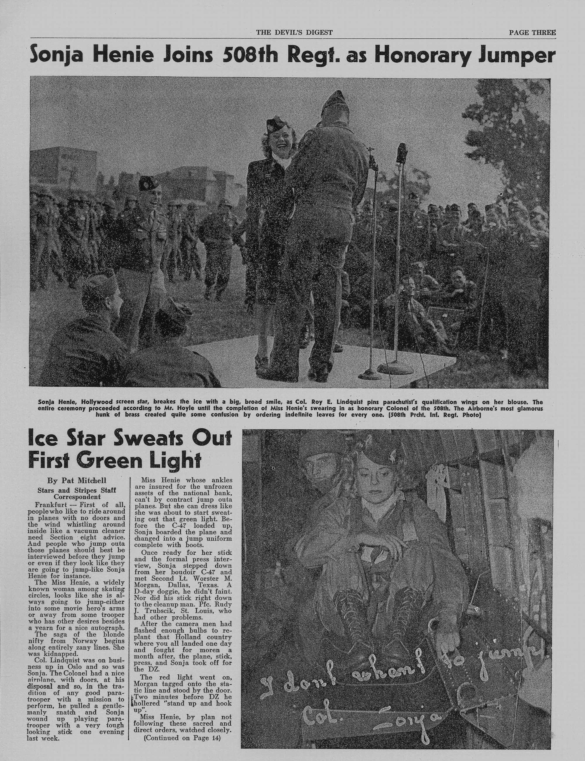 President Truman Reviews 508th |  HEADLINES (click for high resolution) Red Devils Swap Guns For Books As Regiment's Unit School Opens |  HEADLINES (click for high resolution) Sonja Henie Joins 508th Regt. As Honorary Jumper |