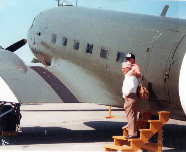 Mendez, wearing cap, and Joe Petry are on the boarding steps. |