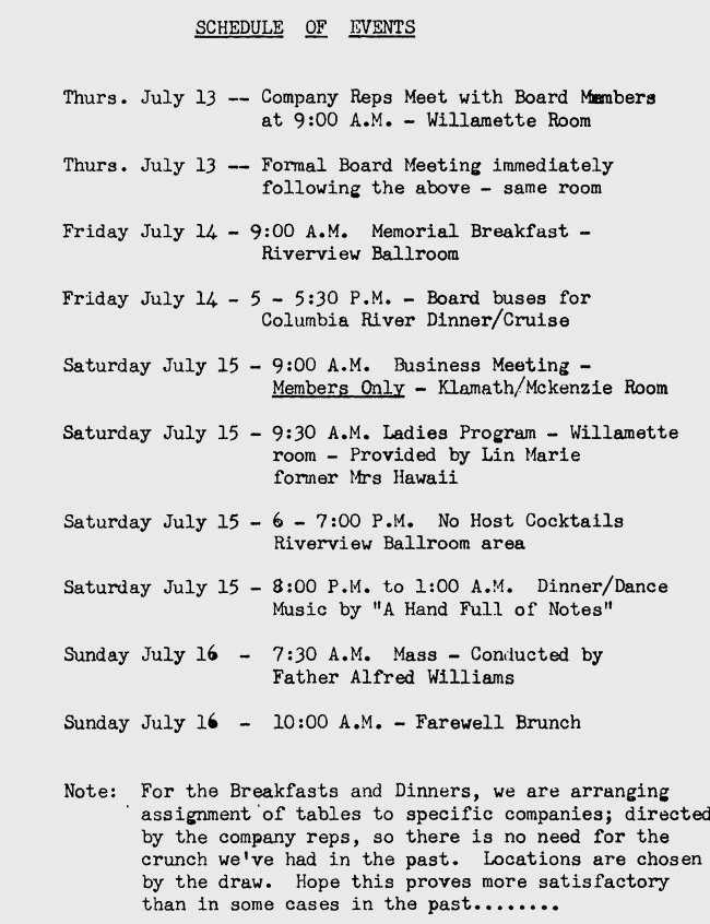 Special events included a dinner cruise on the Columbia River on Friday evening and an evening of dinner and dancing the following night with live music. |
