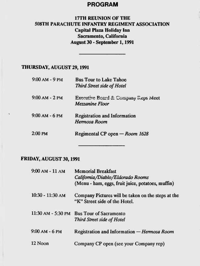 The 508th headed west for its 17th Annual Reunion in Sacramento, CA. The three day session was held from August 30 through September 1, 1991 in the Capital Plaza Holiday Inn.