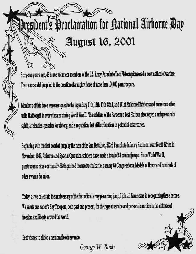 President's Proclamation For National Airborne Day, August 16, 2001" as