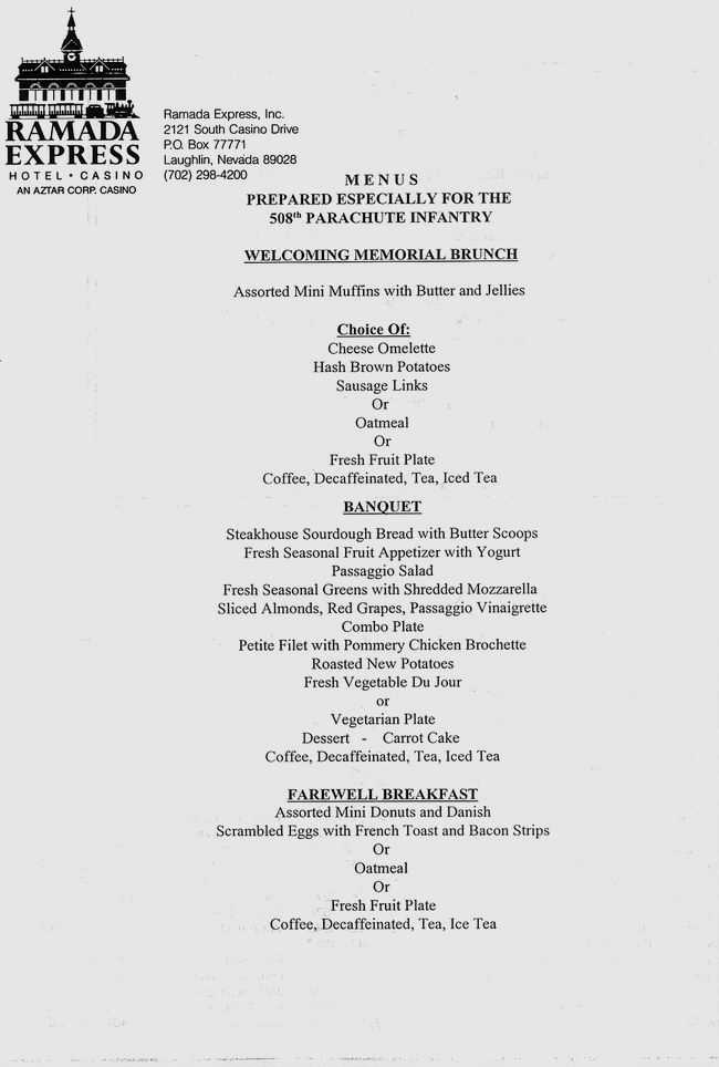 Menus for Memorial Brunch, Banquet and Farewell Breakfast