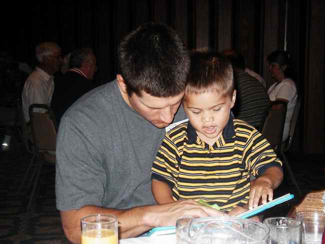 Angel Romeo's son-in-law and grandson have rapt attention to a book. |