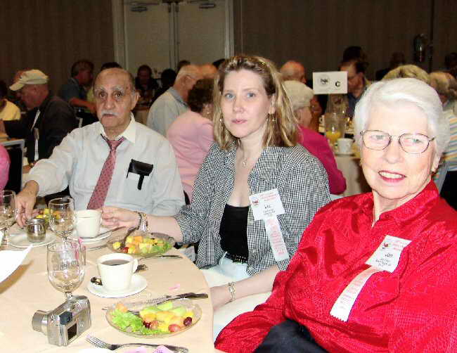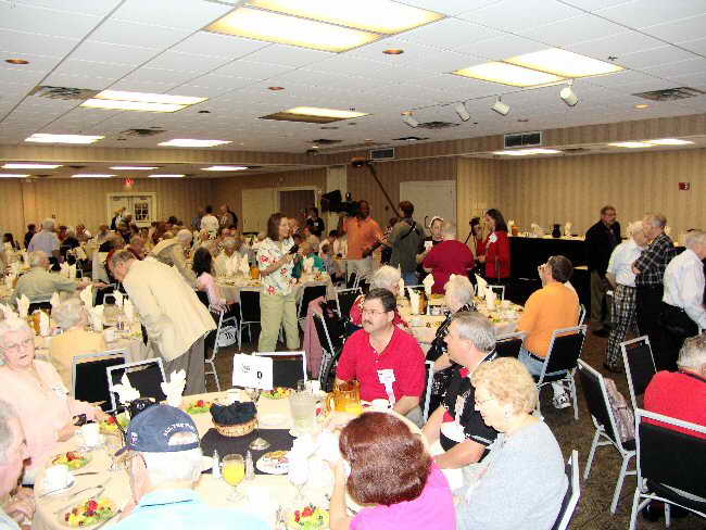 Videographers continue to crank film as the 508th are seared for breakfast |  Mabel and Bill Goudy are joined by unidentified man |  Packed House the 508th attendance was near its all time high |  Co. C Threesome (l-r) Armando Ortiz, Liz Farrell, and Jan Silver |