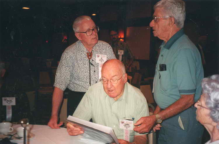 checks a photo album while Irv Shanley chats with indentified man |