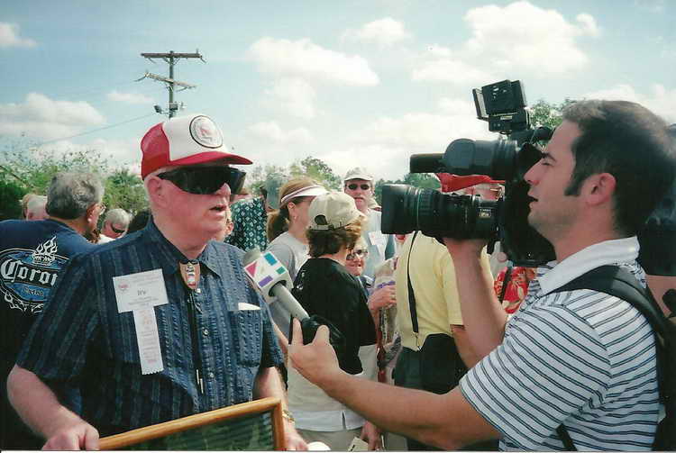 New Donation Irv Shanley holds framed parachute remnant from the farm of Messer Pierre Cotall, Picauville. The item was donated by Zane Schlemmer
