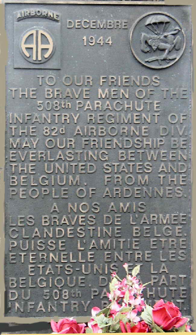 Bronze Tablet "To our friends the brave men of the 508th PIR of the 82nd Airborne Div. May our friendship be everlasting between the United States and Belgium From the people of Ardennes.