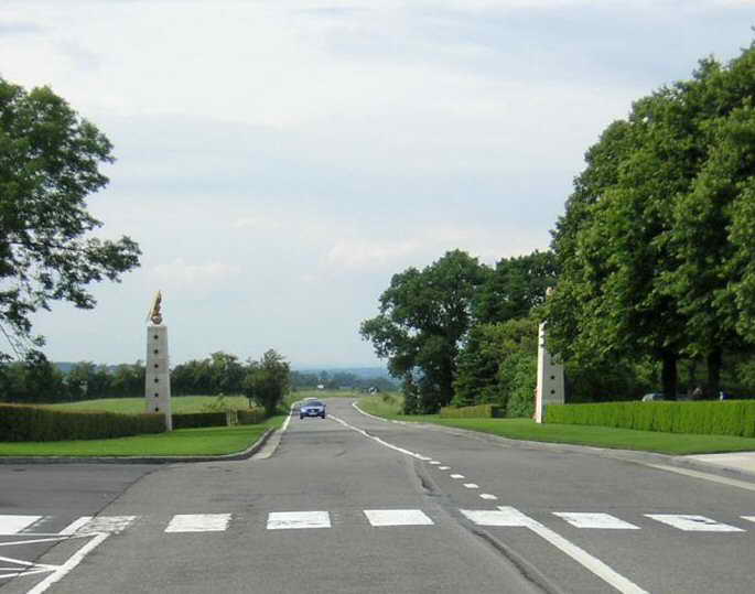 Henri Chapelle Entrance flanked by columns adorned with stars and a gilded eagle atop a golden globe (Photo courtesy of Mrs.. Laura Stelmach)