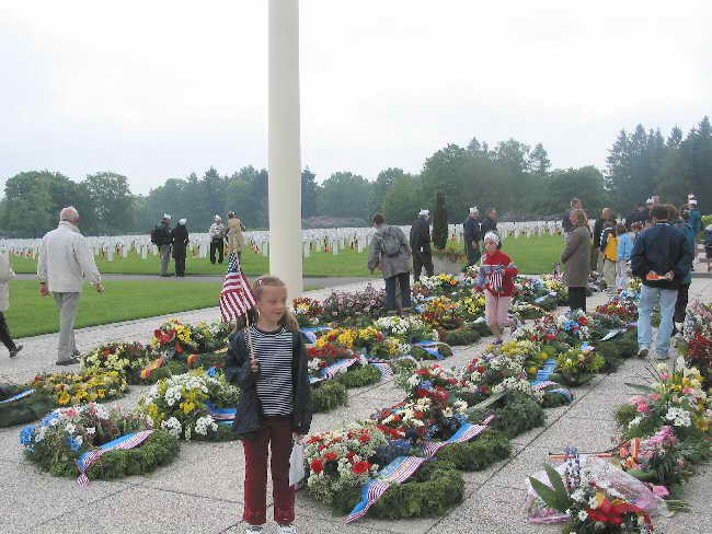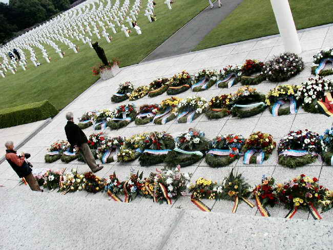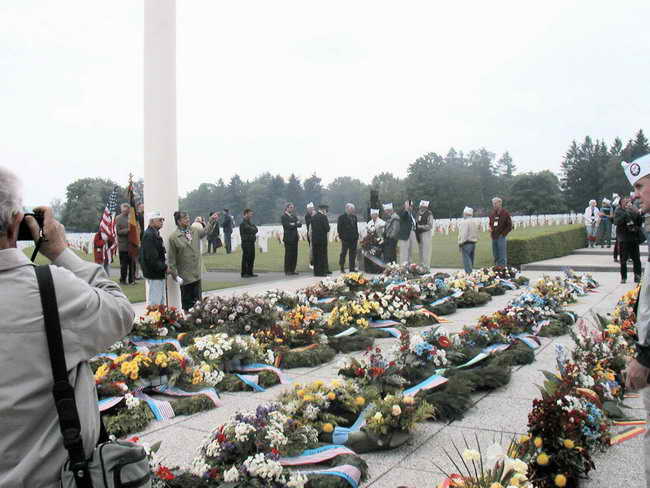 508th Remembers the men of their unit who are resting in the Henri Chapelle grounds. Also participating is [far left] Don Lassen, 505th, Editor of Static Line Magazine. (Photo Courtesy Ellen Peters)