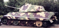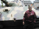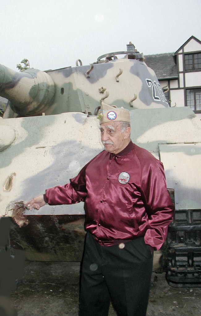 508er Armondo Ortiz poses in front of the Tiger. Note the three impact areas in the hull to the left of him | Super Wedgee Armondo explained that the tank had been abandoned by its crew after it became wedged between two trees. When the Americans got their hands on the tank they used it as a test specimen to see what weaponry would be most effective against this tank's tough hide. The Tiger II stood almost unscathed after various high powered weapons, including bazookas, were fired at it. No shell were able to penetrate the hull.