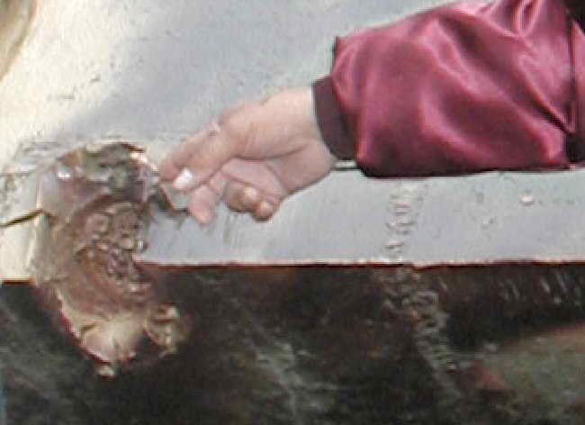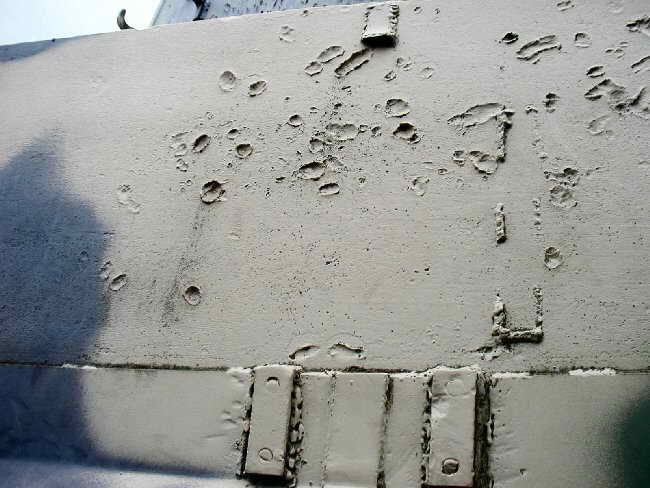 | Impervious Hull Armondo points to the largest and deepest pock mark left by those tests. According to Armondo, this 6 inch deep hole was caused by a 75 mm cannon shell. Note that the shells generated enough heat and power to essentially melt the steel around the point of impact. Nonetheless there was enough hide left to prevent penetration and this steel rhinoceroses could keep going. "Knocking off a track was about the only way to stop them," said Armondo. |