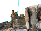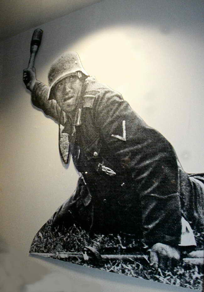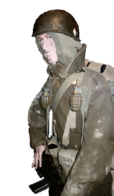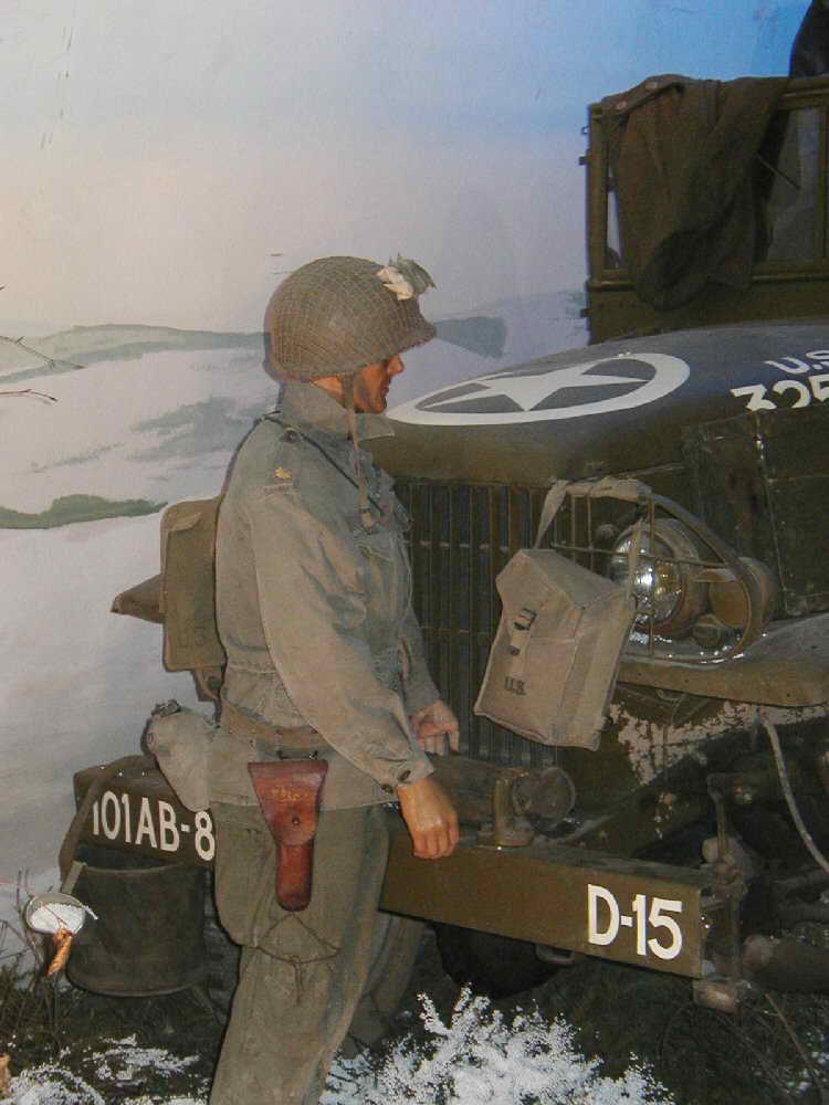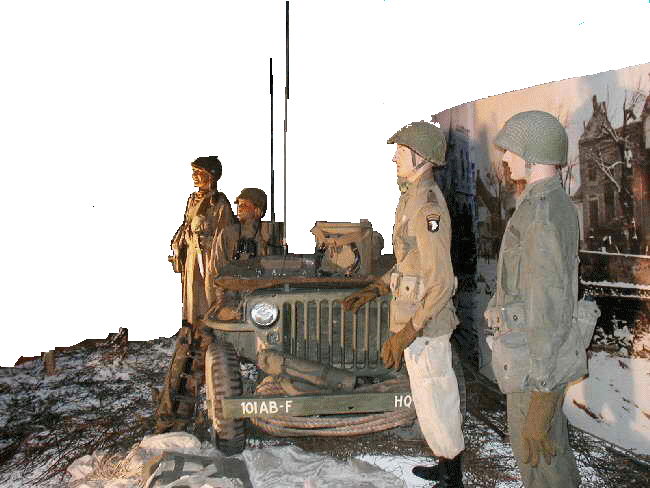 McAuliffe Staff appear to be watching a skirmish with comm. gear at the ready to give further orders |  101st Major Note the field telephone and canvas water bag on the truck's bumper |  The Opposition Camouflaged German Tiger Tank and crew members |  Half Tracked Cycle This is a rare piece of equipment, few were made, even fewer still exist. |