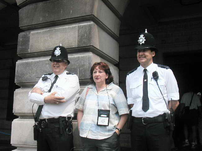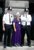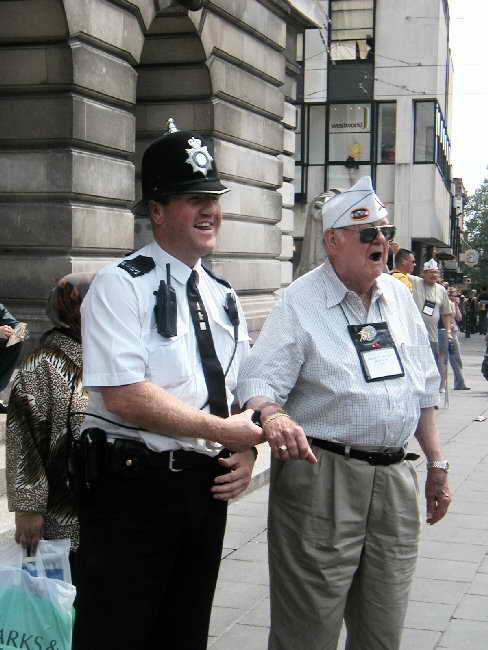 Doubly Guarded Joyce Green is flanked by two of Nottinghamshire's finest |  Gotcha! one of the Static Line tour group was put into handcuffs for "an infraction" |  Posing with the Constables, this lady seems pleased with the company she has chosen |  Lionhearted 508ers [L-R] Front row: Harry Hudec, Guido Pelini, Bob Speers, George Miles, Herman Schoolcraft Back row: Louis Manion, Ernie Lamson, Armondo Ortiz |