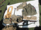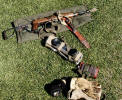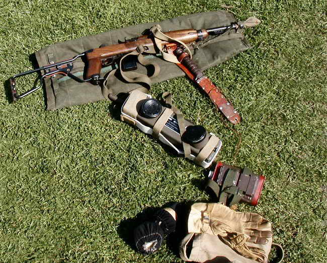John Brown chats with one of the Living History Group members |  WW-II Gear includes an M1 Carbine with folding stock, field radio and trench knife |  Full Kit includes parachute, Mae West flotation vest, entrenching shovel, cartridge belts, canteen, holstered .45, Thompson submachine gun, field jacket with Tec/5 rank insignia, and musette bag |  Light Machinegun completes this impressive weapons array |
