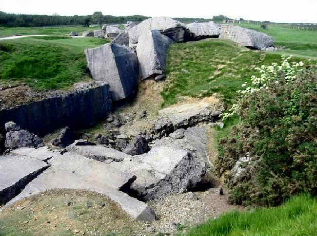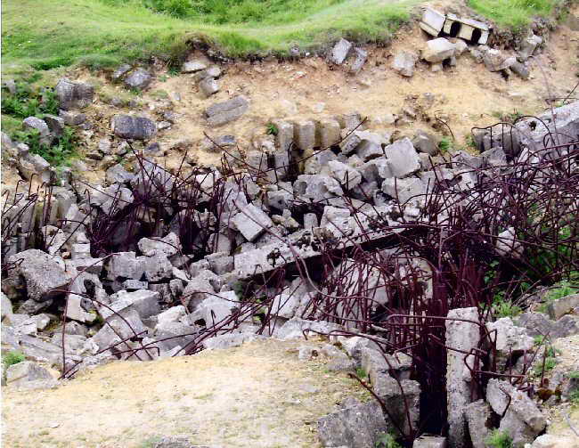 Obliterated This emplacement must have taken a direct hit. Its remains resemble a child's scattered blocks. Reinforcement steel bars, although rusty, survive 60 years after the fact.. (Photo courtesy: Karine Guilbert)