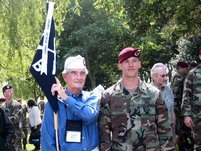 | Proud and Prouder, Co. B Guidon Bearers From Two Eras Soon after the Honor Guard arrived, a Colonel came over to Walter Barrett, and while reading his nametag he said, “I see that you were in B Company of the 508th”... Walter replied, “I sure was. In fact, I was the Guidon Bearer for B Company.” The Colonel said, “This is the Honor Guard of the 508, B Company now based in Italy.” He then asked him if he would like to pose for a picture with the group. Of course, Walter was honored to pose with the young soldiers. Walter told him that his First Sergeant, Jim Smith in Ft. Bragg, N.C. had recently sent the original B Company “tattered and torn” flag to Italy to be placed in the Archives. Following the war, the flag was carried by 508th Veteran “old timers” in their march at the “All American Week” celebration each year in Ft. Bragg, N. C. "The Colonel said. “Tell your First Sergeant that we have it and it is where it should be.” (Photo courtesy Ellen Peters)