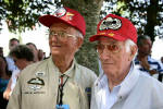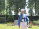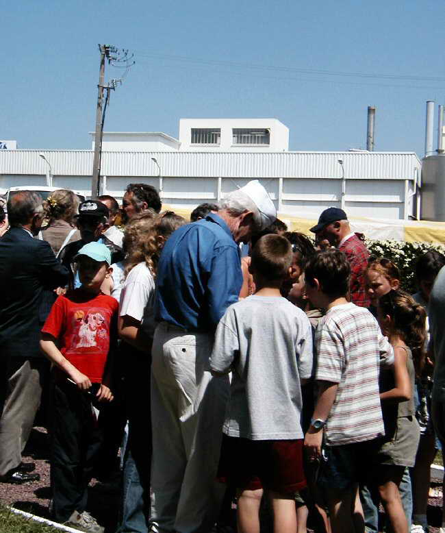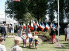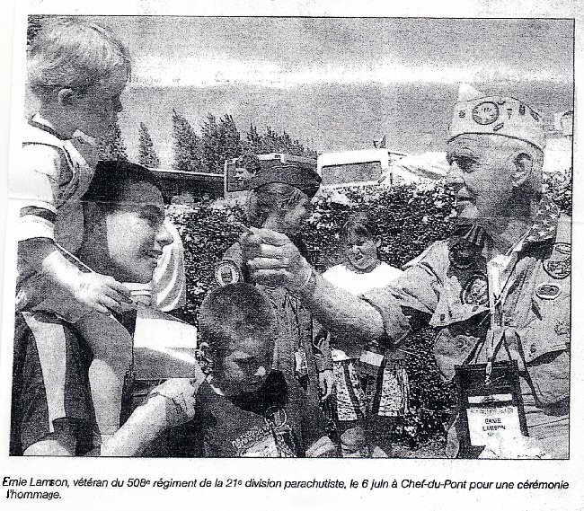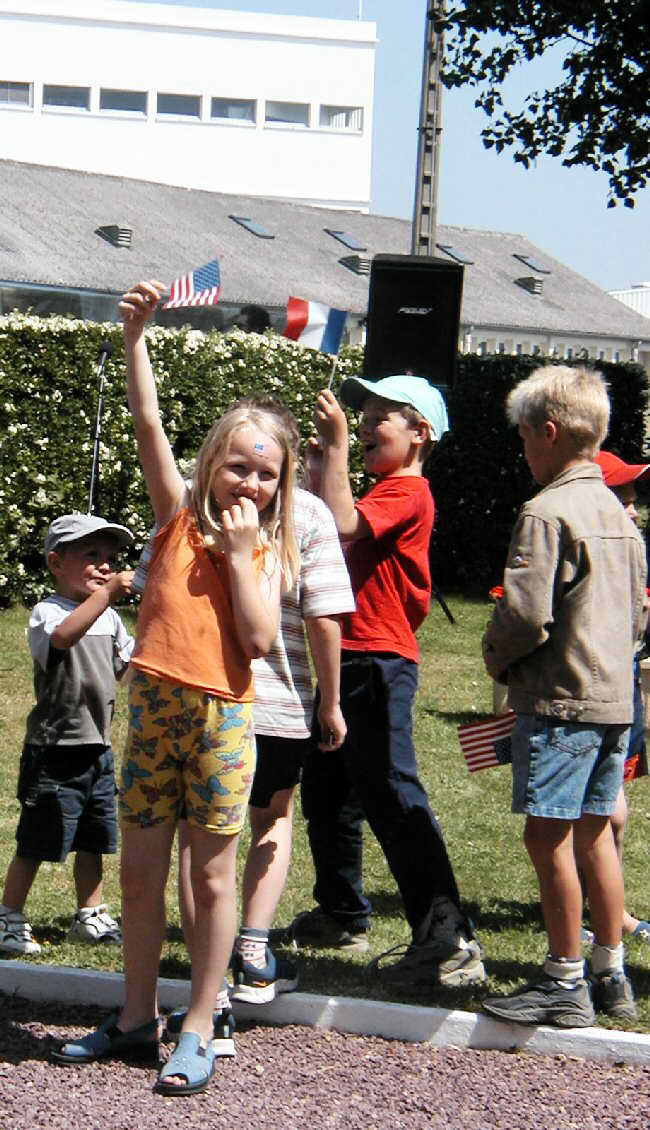 French Flags adorn the rear of the park |  Reminiscing Jack Schlegel (l) and Tom Porcella observe the ceremonies. Both 508ers have become somewhat local legends in this area of Normandy. (Photo courtesy Patrick Elie) |  Walter Barrett also posed for a shot in front of the memorial area (Photo courtesy Ellen Peters) |  Little Flag-Wavers a number of children took advantage of the ceremony and vigorously wagged their U.S. flags |