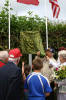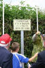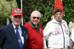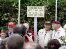 Camouflage material was very fitting shroud for the yet to be dedicated sign (Photo courtesy Patrick Elie) |  Unveiling with a simple tug of the cloth revealed the sign for all to admire (Photo courtesy Patrick Elie) |  Crossroads Named Lt. W. W. Millsaps and Lt. L. L. Polette were honored with the naming of this Carrefour (crossroads) (Photo courtesy Bill Nation) |  Old Buddies [L-R], Tom Porcella, Chet Graham and Howard Manoian smile for the cameras (Photo courtesy Patrick Elie) |