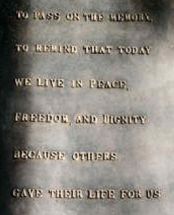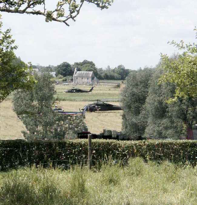 | Reminiscent of the D-Day invasion, the choppers in this rural scene takes one back to the day when gliders were strewn about Normandy fields such as this one | Near The La Fiere Bridge is a small and simple memorial that reads: "To Pass On The Memory To Remind That Today We Live-In Peace Freedom And Dignity Because Others Gave Their Life For Us" (Click on photo for enlarged view) |