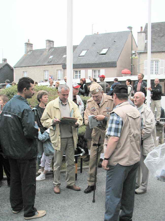|  Encircled by autograph seekers, Harry Hudec is pleased to comply | Her Fondest Wish was to be photographed with veterans and perhaps she got more than she had hoped for. Dick O'Donnell (Vietnam) stands at left with wife Tsugi. Bob Speers (WW-II and Korea) is at far right while his grandson Josh French (Iraq) is at the rear.