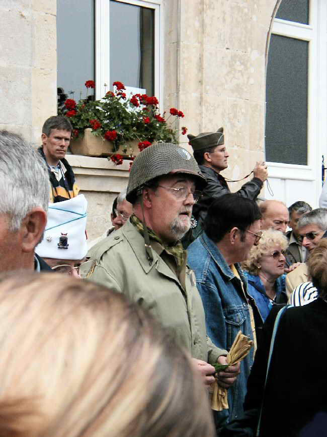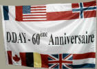 A children’s choir sang the French national anthem. They were followed by a choral group called “The Children of 1944” (adults who as children experienced the invasion). The group sang the American national anthem in French. |  Mini Museum in the lobby of the ex-hotel cum town hall contains many mementos from the WW-II era and souvenirs given by veterans during past visits |  Anniversary Flag is ringed by images of the flags of Allied nations. [l-r]Top row: France, U.S.A., Poland and Norway Bottom row: Canada, Belgium, United Kingdom, Netherlands |  Floral Tribute was placed on this monument by an someone that wanted to express their feelings in a simple but touching manner |