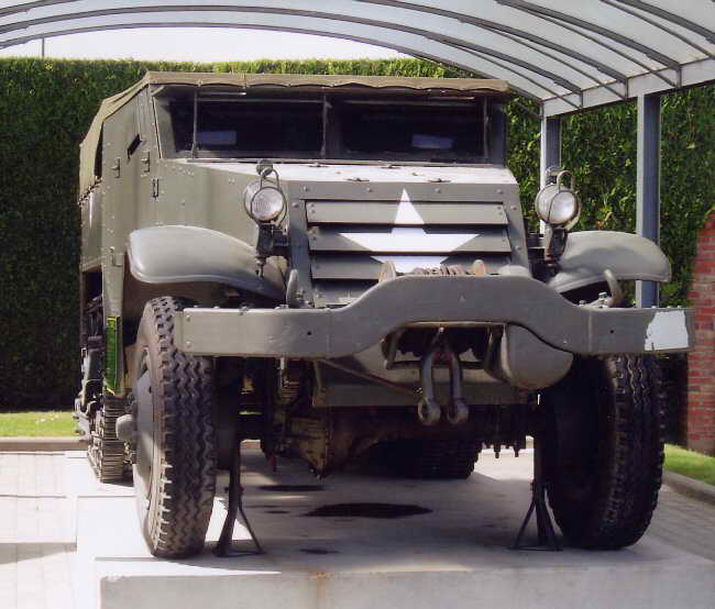 M-2 Halftrack Vehicle came in a variety of versions including a 75mm Howitzer model.. Note passenger door view slot, heavy winch under raised bumper center, tow link and tow hooks (Photo courtesy Karine Guilbert)