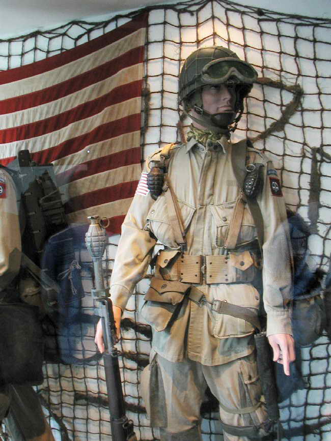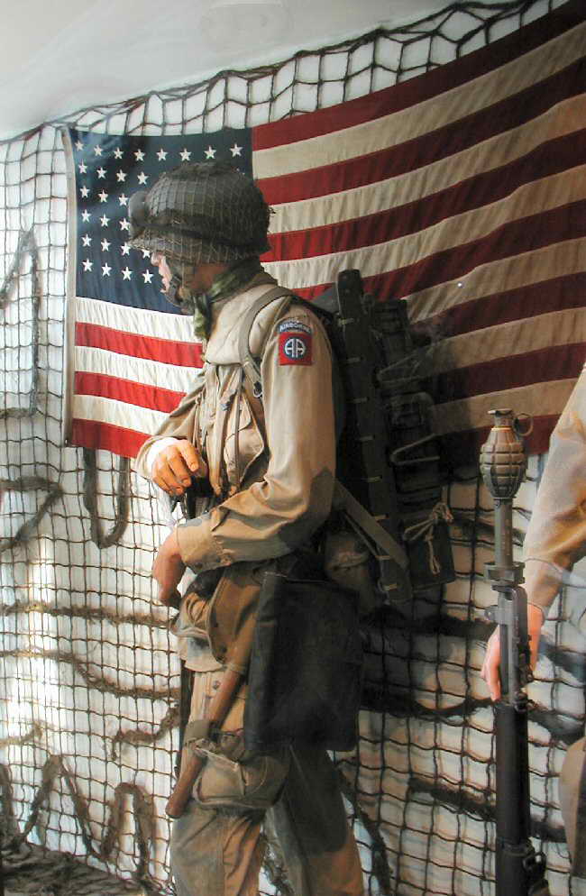 an 82nd ABN Division trooper stands in full regalia equipped as he would have been on the D-Day jump